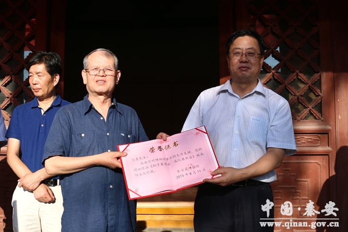 。ǹh委書(shū)記王東紅為馬勇先生頒發(fā)“秦安縣博物館收藏證書(shū)”)