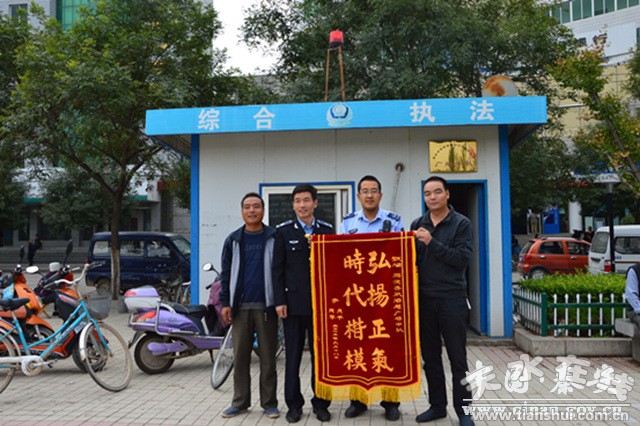 9月15日,家住秦安縣御景華庭的李貴軍、李貴平兄弟兩個(gè)來(lái)到秦安縣執(zhí)法局廣場(chǎng)中隊(duì),將一面寫有“弘揚(yáng)正氣、時(shí)代楷!钡腻\旗送到中隊(duì)長(zhǎng)邵王軍和隊(duì)員李建軍同志的手中,表達(dá)對(duì)城管人員及時(shí)救助自己父親的感激之情。