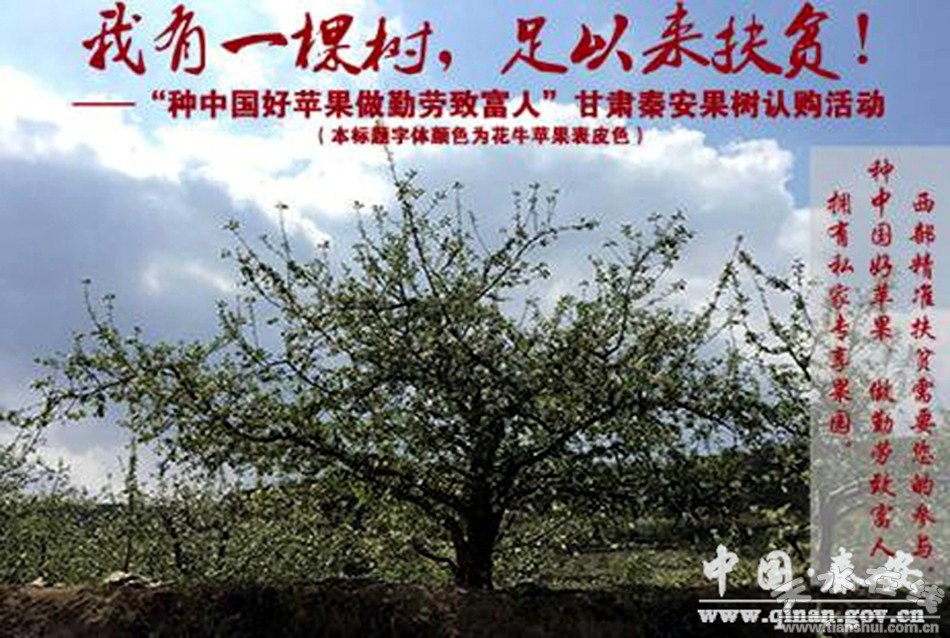 今年4月,秦安縣電子商務服務中心發(fā)起“我有一棵樹,足以來扶貧——甘肅秦安果樹認購活動”,并通過微信等新媒體渠道廣而告之。網友在全年任何時候都可以認購秦安的蘋果樹,待到蘋果成熟時,果農再采收并發(fā)送給客戶。
