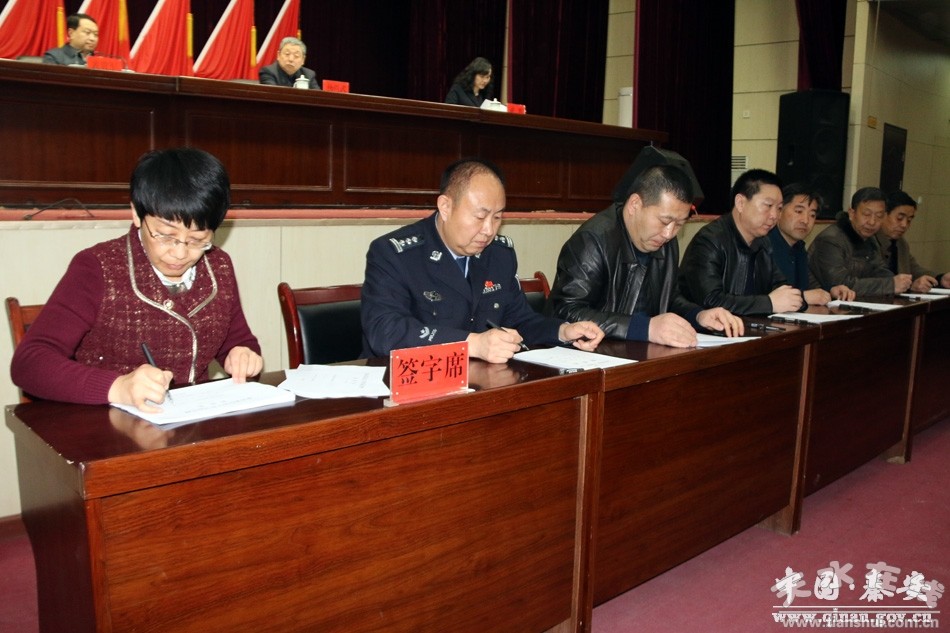 會(huì)議由縣委副書記裴貴軍主持。會(huì)上,縣委常委、政法委書記楊喜春和縣政府副縣長(zhǎng)張海龍分別宣讀了關(guān)于表彰2016年度全縣綜治(平安建設(shè))工作、維護(hù)穩(wěn)定工作、信訪工作先進(jìn)鄉(xiāng)鎮(zhèn)和先進(jìn)單位以及防范和處理邪教工作先進(jìn)鄉(xiāng)鎮(zhèn)、先進(jìn)單位、先進(jìn)個(gè)人,優(yōu)秀村級(jí)網(wǎng)格信息員的決定;縣領(lǐng)導(dǎo)為獲獎(jiǎng)鄉(xiāng)鎮(zhèn)、單位和個(gè)人頒發(fā)了獎(jiǎng)牌和證書;縣委常委、政法委書記楊喜春作了工作報(bào)告,并與相關(guān)鄉(xiāng)鎮(zhèn)和單位簽訂了維護(hù)穩(wěn)定工作目標(biāo)管理責(zé)任書和防范處理邪教工作目標(biāo)管理責(zé)任書;縣委副書記、縣長(zhǎng)程江芬作了講話,并與相關(guān)鄉(xiāng)鎮(zhèn)和單位簽訂了綜治(平安建設(shè))工作目標(biāo)管理責(zé)任書和信訪工作目標(biāo)管理責(zé)任書。
