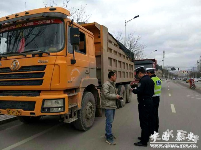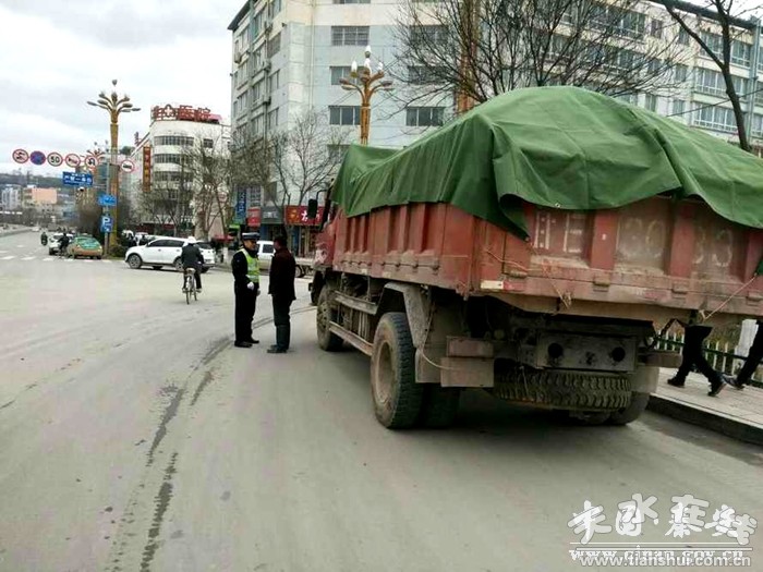 秦安縣交警隊(duì)嚴(yán)查渣土車駛?cè)氤菂^(qū)主道路