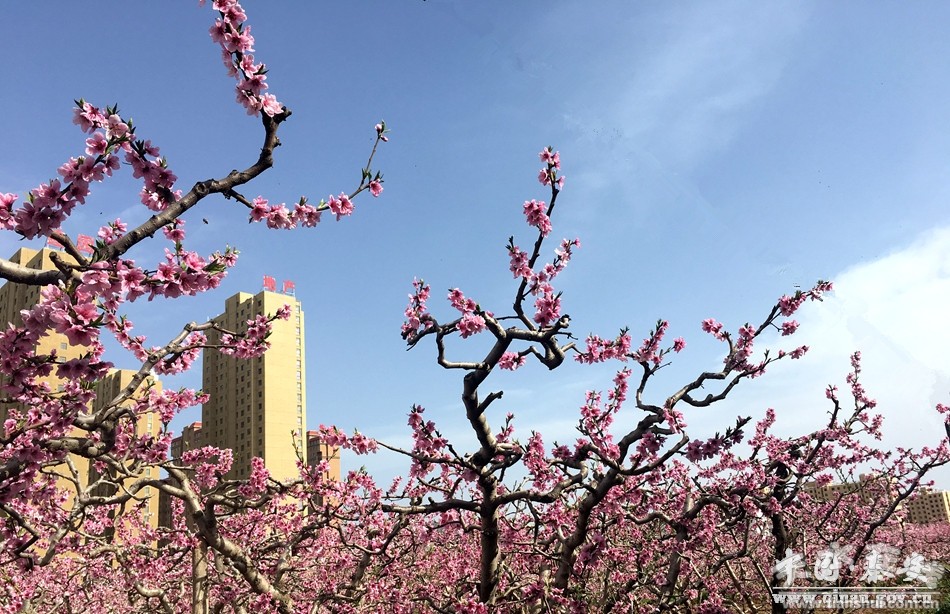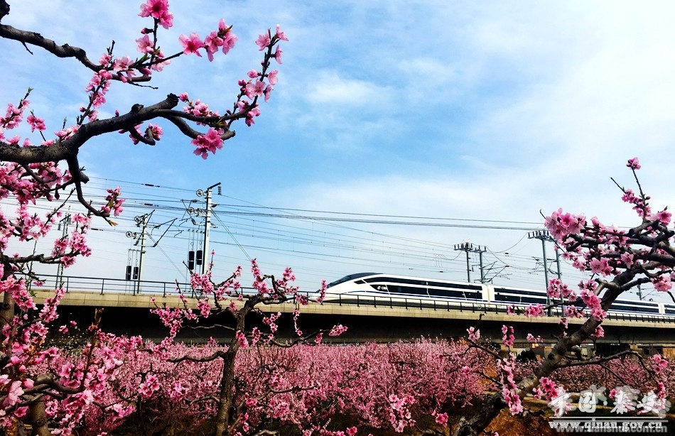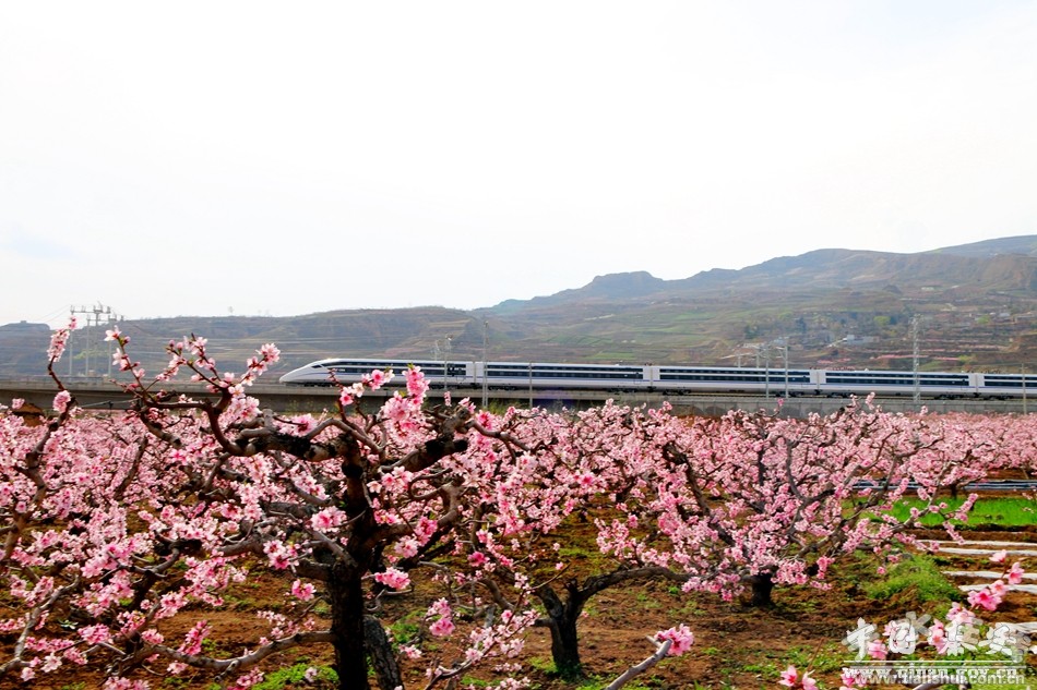人間四月芳菲盡,秦安桃花漫山開。眼下正是秦安桃花盛放的時節(jié),在秦安縣西川鎮(zhèn)宋場桃園景區(qū),枝枝桃花爭奇斗艷,個個果農(nóng)疏花正忙,寶蘭高鐵線上飛馳的一列列動車時不時在花田上空穿越,仿佛一條長龍蜿蜒前行,構(gòu)成一幅蒙特奇般動靜相間的圖畫,讓人心曠神怡,美不勝收,被游客贊為“開往春天的列車”。