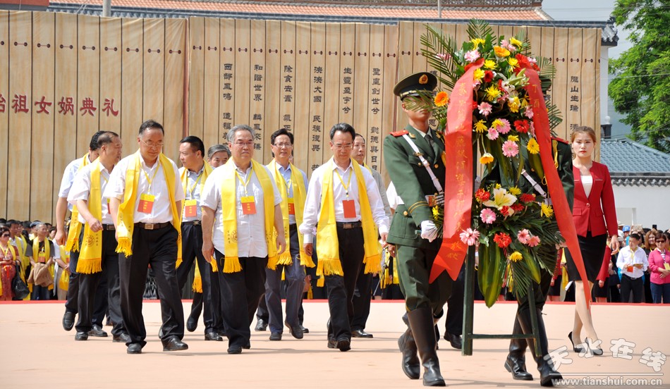 在悠揚的古箏樂中,華人華僑代表;中央人民政府駐香港特別行政區(qū)聯(lián)絡(luò)辦公室;港、澳嘉賓;省上離退休老干部;秦安籍地廳級領(lǐng)導干部代表;天水市四大組織領(lǐng)導;市上離退休老干部;秦安縣戰(zhàn)略合作協(xié)議、國家對口幫扶單位嘉賓;秦安縣文化交流友好縣區(qū)代表;天水市兩區(qū)四縣主要領(lǐng)導;秦安縣四大組織在家領(lǐng)導;天水市市直部門負責人;祭祀活動贊助企業(yè);《媧皇頌》詞曲作者、演唱者,《中華文化從秦安走來》攝制組代表;秦安縣省黨代會代表、省人大代表、先進模范人物、青少年代表依次進入女媧祠內(nèi)敬獻花籃、謁祠拜祖。