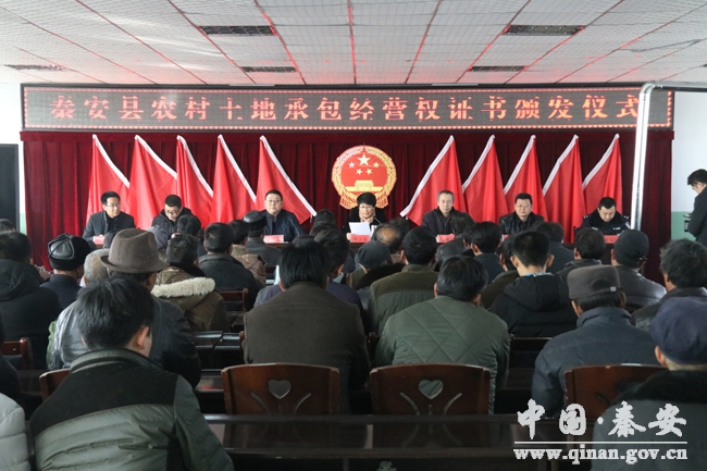 1月17日,秦安縣在王窯鎮(zhèn)舉行農(nóng)村土地承包經(jīng)營權(quán)證書頒發(fā)儀式,會上向該鎮(zhèn)丁山、張洼兩村村民代表頒發(fā)了四至清楚、面積精確、更加規(guī)范的《農(nóng)村土地承包經(jīng)營權(quán)證書》,標(biāo)志著全縣廣大農(nóng)民的承包耕地從此有了受法律保護的“身份證”?h土地確權(quán)頒證工作領(lǐng)導(dǎo)小組主要成員單位農(nóng)業(yè)局、國土局、檔案局、公安局負(fù)責(zé)人,王窯鎮(zhèn)黨政領(lǐng)導(dǎo)和鎮(zhèn)村干部,丁山村、張洼村村民代表及測繪公司主要負(fù)責(zé)人參加了頒發(fā)儀式。頒證儀式由縣政府副縣長丁遲成主持。