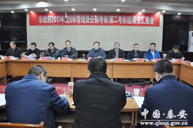 考核匯報(bào)會(huì)上,縣政府副縣長(zhǎng)于劍鋒全面匯報(bào)了秦安縣2017年度目標(biāo)管理責(zé)任制完成情況,市政府副秘書長(zhǎng)、外事僑務(wù)辦主任張有信就考核相關(guān)事項(xiàng)作了安排。隨后,考核組分成6個(gè)小組分別深入各自考核點(diǎn),通過實(shí)地查看、查閱資料、聽取匯報(bào)等方式,就秦安縣2017年度公共文化服務(wù)體系建設(shè)、旅游總收入增速、教育工作、綜合科技進(jìn)步水平指數(shù)、食品藥品安全、水資源管理制度落實(shí)等工作進(jìn)行了全面考核?己私M對(duì)秦安縣過去一年來的工作給予充分肯定,認(rèn)為秦安縣目標(biāo)明確,舉措得力,落實(shí)到位,成效顯著,較好地完成了市政府確定的各項(xiàng)目標(biāo)任務(wù)。