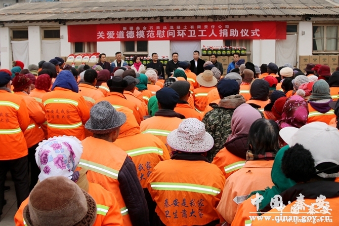 2018年1月26日,深冬的秦安有些冷,然而300多名環(huán)衛(wèi)工人的臉上寫滿了幸福。因為他們感受到了黨和政府對他們的關懷,感受到了社會對他們的理解。這讓他們更加懂得了環(huán)境衛(wèi)生是城市窗口與形象的真諦,而他們則是這窗口與形象的忠實守護者。凡職業(yè)都是神圣的,人的價值往往就在平凡中彰顯。新疆鑫金石商品混凝土有限責任公司董事長任繼鵬為秦安縣第四屆道德模范、縣環(huán)衛(wèi)所環(huán)衛(wèi)工人伏四世捐助資金20000元,為300多名環(huán)衛(wèi)工人送上30000多元的慰問品。
