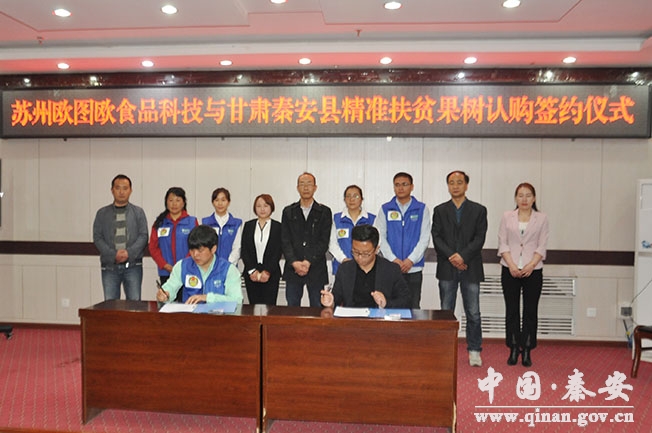 4月23日,蘇州歐圖歐食品有限公司、臺(tái)州社會(huì)代表人士組織聯(lián)誼會(huì)分別與天水華園果業(yè)進(jìn)出口有限公司簽訂了果樹(shù)認(rèn)購(gòu)協(xié)議。副縣長(zhǎng)李廣宇及縣扶貧辦、商務(wù)局、果業(yè)局負(fù)責(zé)人在縣行政中心參加了簽約儀式。