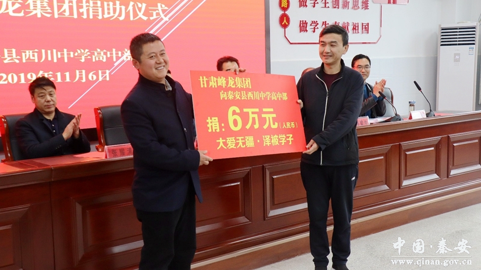 據(jù)了解,此次資助期限為三年,本屆學(xué)生畢業(yè)后,甘肅省峰龍集團將繼續(xù)對下一屆優(yōu)秀學(xué)生進行資助。學(xué)校為感謝峰龍集團情系學(xué)子的善舉,特將此次受資助的2019級高一一班命名為“峰龍班”。