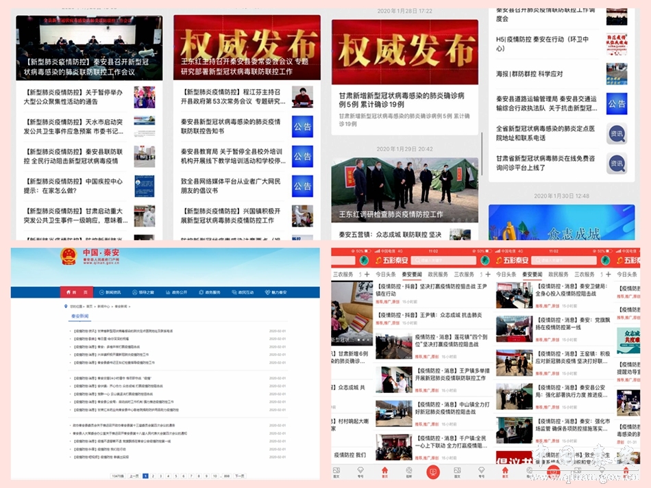 秦安縣加強(qiáng)對(duì)權(quán)威信息的發(fā)布和各項(xiàng)防控救治措施、防控科普知識(shí)的報(bào)道宣傳,并利用各類(lèi)新媒體陣地等加大傳播力度,根據(jù)疫情變化和社會(huì)熱點(diǎn)及時(shí)解疑釋惑,避免社會(huì)恐慌,維護(hù)社會(huì)穩(wěn)定?h融媒體中心在秦安政府網(wǎng)、五彩秦安APP、秦安電視臺(tái)、秦安廣播站、天水秦安發(fā)布微信微博等所有平臺(tái)開(kāi)設(shè)“疫情防控”專(zhuān)題專(zhuān)欄,并下設(shè)消息、資訊、人物、H5、抖音、海報(bào)、美篇、短視頻、標(biāo)語(yǔ)、通告、公告、倡議、慰問(wèn)、捐贈(zèng)等10多個(gè)子欄目,安排中心策采編發(fā)一線(xiàn)人員,除做好常規(guī)化新聞報(bào)道外,還制定疫情報(bào)道選題,挖掘先進(jìn)典型事跡,總結(jié)防控經(jīng)驗(yàn)做法,創(chuàng)新豐富報(bào)道形式,從而全方位、多角度地宣傳好全縣疫情防控工作。同時(shí)與各鎮(zhèn)各部門(mén)建立“縣融媒·疫情防控在行動(dòng)”微信群,加強(qiáng)溝通對(duì)接聯(lián)系,及時(shí)了解基層動(dòng)態(tài),真正形成了上下聯(lián)動(dòng)、互通互補(bǔ)、齊心協(xié)力的全縣疫情防控宣傳大格局。從1月23日開(kāi)始,各平臺(tái)每天稿件平均發(fā)布量達(dá)到100篇次以上,并及時(shí)向天水電視臺(tái)、天水日?qǐng)?bào)、天水在線(xiàn)、天水廣電網(wǎng)、天天天水網(wǎng)、新甘肅、甘肅電視臺(tái)、甘肅日?qǐng)?bào)等省市主流媒體積極推送,達(dá)到了很好的宣傳效果,營(yíng)造出全縣疫情防控的良好氛圍。