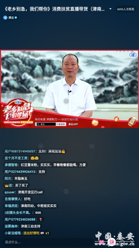 6月10日,由津云新媒體策劃推出的“老鄉(xiāng)別急,我們幫你”消費(fèi)扶貧直播帶貨系列公益活動(dòng)第二場——津南幫扶專場準(zhǔn)時(shí)開播,天津市津南區(qū)區(qū)長賀亦農(nóng)變身“帶貨主播”,在“抖音”和津云客戶端平臺(tái)同步直播,和網(wǎng)友積極互動(dòng),為秦安縣花椒和花椒芽菜醬代言,助力秦安縣特色農(nóng)產(chǎn)品線上銷售。