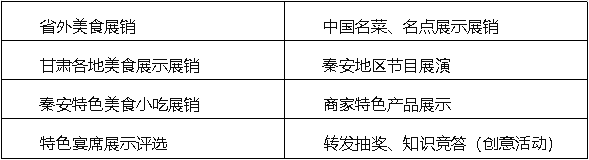 匯聚秦安及全國各地風(fēng)味特色小吃,包括本地特色、各地知名企業(yè)、小吃和名優(yōu)產(chǎn)品,及異域風(fēng)味美食,集中展示,拉攏人氣。同時向各知名特色小吃贈送展位,以秦安本土餐飲名企為主,每種特色小吃不超過3家企業(yè)。共計20個展位,展位按計劃招商。