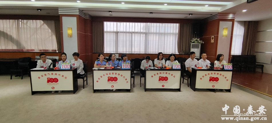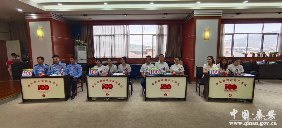 為慶祝中國(guó)共產(chǎn)黨成立100周年,營(yíng)造濃厚的黨史學(xué)習(xí)教育氛圍,檢驗(yàn)黨史學(xué)習(xí)成效,6月17日,秦安縣開展了“知史愛黨·不忘初心”黨史知識(shí)競(jìng)賽小組賽(第七場(chǎng)),秦安縣公安局、縣解放紀(jì)念館、縣委編辦、縣財(cái)政局、縣氣象局、縣市場(chǎng)監(jiān)督管理局、縣統(tǒng)計(jì)局和縣應(yīng)急管理局八支代表隊(duì)參加比賽。