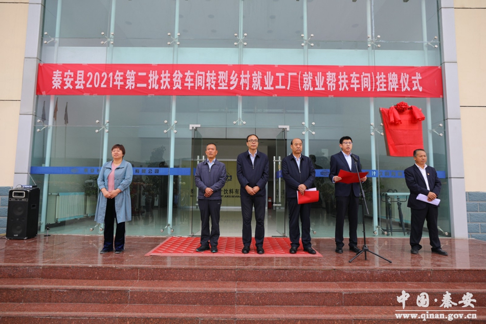 秦安縣人大常委會(huì)副主任宋捷主持掛牌儀式;縣人社局負(fù)責(zé)人宣讀了《關(guān)于進(jìn)一步推動(dòng)扶貧車間健康發(fā)展的通知》和《秦安縣2021年扶貧車間轉(zhuǎn)型持續(xù)發(fā)展認(rèn)定第二批鄉(xiāng)村就業(yè)工廠(鄉(xiāng)村就業(yè)幫扶車間)的通知》;秦安長(zhǎng)城果汁飲料有限公司負(fù)責(zé)人作了發(fā)言;縣政府副縣長(zhǎng)楊成作了講話。