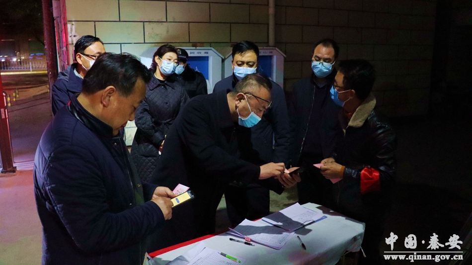 10月23日晚,秦安縣領(lǐng)導(dǎo)張俊義、常樂(lè)、董文海、張濤濤到城區(qū)部分小區(qū)、社區(qū)、酒店和公路卡口夜查指導(dǎo)疫情防控工作。