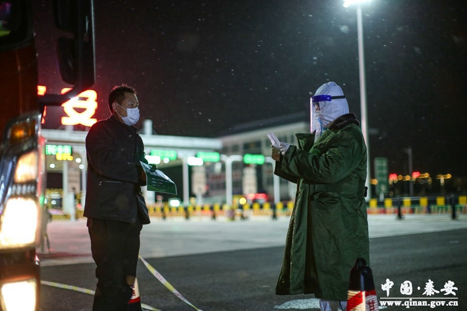 “您好,請(qǐng)?jiān)诖藪叽a登記。”在秦安縣高速卡口,縣交通運(yùn)輸局高速卡口值班負(fù)責(zé)人魏強(qiáng)弟正引導(dǎo)從外地返回秦安的司機(jī)登記測(cè)溫。11月6日晚,深秋的秦安縣氣溫驟降,雪花漫天飛舞,魏強(qiáng)弟和其他工作人員在凜冽寒風(fēng)中依然堅(jiān)守在執(zhí)勤點(diǎn)。