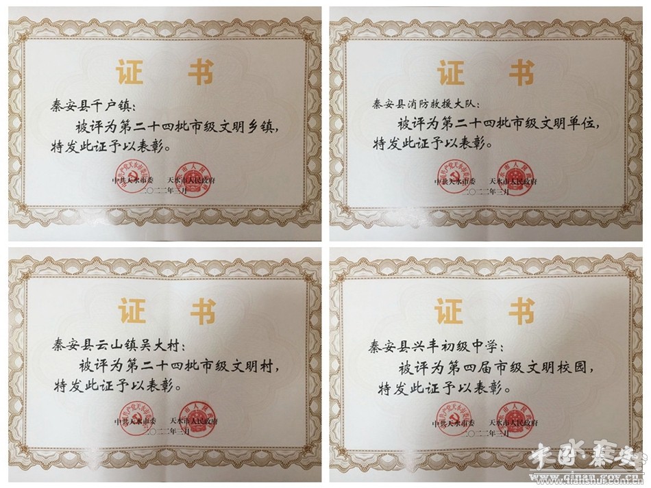 為全面展示精神文明建設(shè)豐碩成果,激發(fā)各縣區(qū)各部門參與精神文明建設(shè)積極性主動(dòng)性創(chuàng)造性,近日,市委市政府表彰命名第二十四批市級(jí)精神文明建設(shè)先進(jìn)集體。秦安縣消防救援大隊(duì)、秦安縣文化館被授予第二十四批“市級(jí)文明單位”榮譽(yù)稱號(hào),秦安縣千戶鎮(zhèn)被授予“市級(jí)文明鄉(xiāng)鎮(zhèn)”榮譽(yù)稱號(hào),秦安縣安伏鎮(zhèn)劉洼村、秦安縣西川鎮(zhèn)姜灣村、秦安縣云山鎮(zhèn)吳大村、秦安縣興豐鎮(zhèn)上陳村被授予“市級(jí)文明村”榮譽(yù)稱號(hào)。安伏中學(xué)、隴城初級(jí)中學(xué)、興豐初級(jí)中學(xué)、王窯鎮(zhèn)中心小學(xué)、中山初級(jí)中學(xué)5所學(xué)校被授予第四屆“市級(jí)文明校園”榮譽(yù)稱號(hào)。