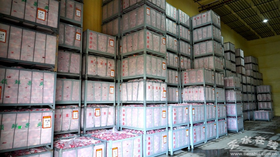 在魏店鎮(zhèn)貴園宏果業(yè)公司的倉庫中,收購好的蘋果整齊地堆放在冷庫當中。從各個代收點往來運輸蘋果的車輛絡繹不絕,叉車不停的取下打包好的蘋果包裝箱,貼上標簽后入庫冷藏。