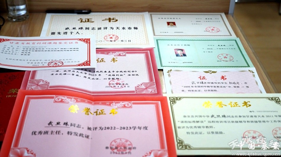 榮譽激勵,再接再厲。武旦珠自任教以來,潛心教書育人,默默耕耘,任勞任怨,用實際行動踐行師者的職業(yè)道德,作為甘肅省“金鑰匙”導(dǎo)師團導(dǎo)師,天水市“義務(wù)教育階段學(xué)科中心教研組”組長的他,先后獲得多項榮譽。2018年確定為天水市骨干教師;2020年確定為天水市學(xué)科帶頭人。2001年至2016年縣委縣政府三次授予“園丁”稱號;2013年、2023年兩次被縣政府評為“優(yōu)秀班主任”;2011年被縣委縣政府評為“十佳師德標兵”;2018年被北京科技大學(xué)授予為“秦安縣教師敬業(yè)奉獻獎”。在省市級刊物發(fā)表論文十多篇。輔導(dǎo)的3名學(xué)生各自獲得“全國初中數(shù)學(xué)竟賽”一等獎。
