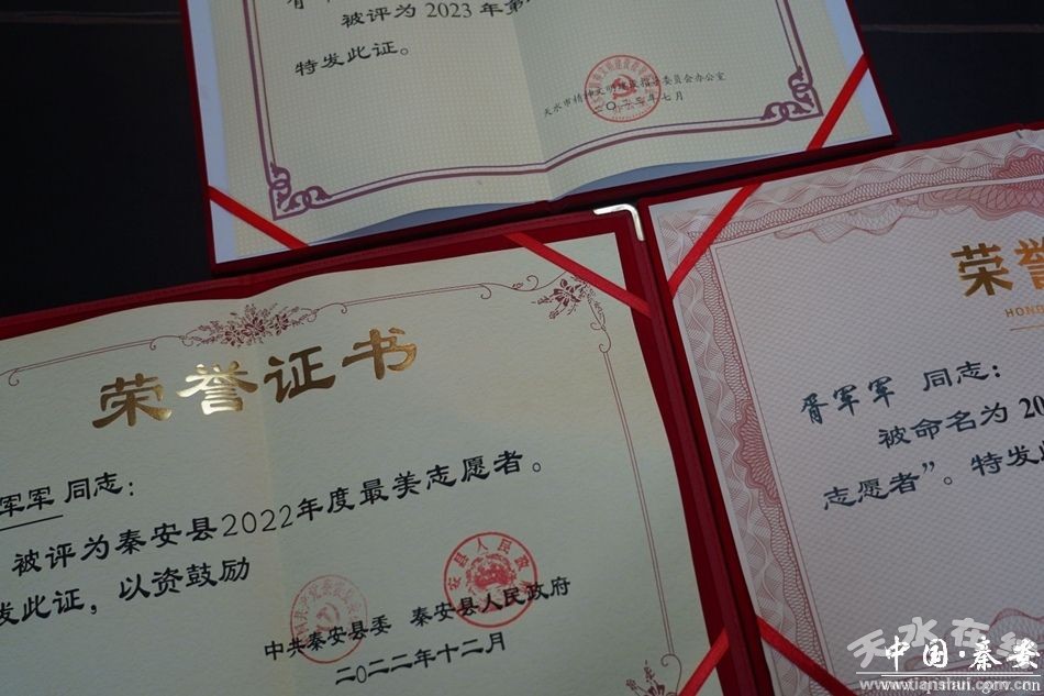 自他在黨旗下莊嚴(yán)的宣誓,加入中國共產(chǎn)黨以來,他始終堅守信念,踐行全心全意為人民服務(wù)的承諾,踏實工作,無私奉獻(xiàn),那里有困難那里就有他的身影。他于2019年1月被秦安縣月十團(tuán)公益協(xié)會評為“年度最佳志愿者”、2022年12月被中共秦安縣委、秦安縣人民政府評為“秦安縣2022年度最美志愿者”、2023年1月被天水市精神文明建設(shè)指導(dǎo)委員會評為“2022年度學(xué)雷鋒志愿服務(wù)最美志愿者”等榮譽(yù)。