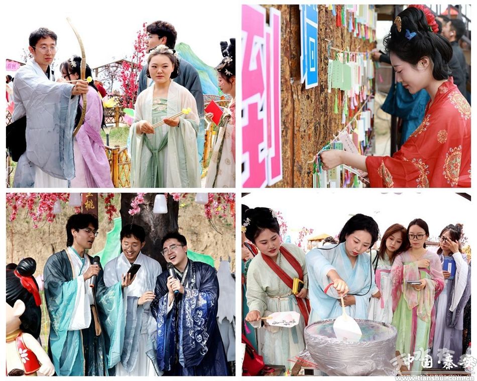 活動(dòng)現(xiàn)場,漫山桃花競相開放,粉白花海與青山相映成趣,處處皆是浪漫氛圍。參與活動(dòng)的青年們身著漢服,手持國風(fēng)通關(guān)文牒,打卡漆扇繪制、香囊制作、投壺、射箭、詩詞飛花令等游戲環(huán)節(jié),在趣味游戲中輕松破冰、褪去陌生;青春合唱環(huán)節(jié),大家圍坐歡歌、齊聲合唱,用歌聲傳遞青春朝氣,將現(xiàn)場浪漫氛圍推向高潮;活動(dòng)最后,大家自由漫步花海拍照打卡,定格春日里的美好青春瞬間。