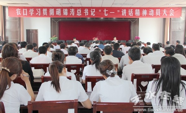 縣委副書記劉中秋作了重要講話,縣政府副縣長(zhǎng)蔡俊杰主持會(huì)議,縣委農(nóng)工部部長(zhǎng)竇明輝宣讀了中共清水縣委關(guān)于學(xué)習(xí)貫徹《胡錦濤總書記在慶祝中國(guó)共產(chǎn)黨成立90周年大會(huì)上講話》的安排意見。農(nóng)口全體干部職工參加了會(huì)議。