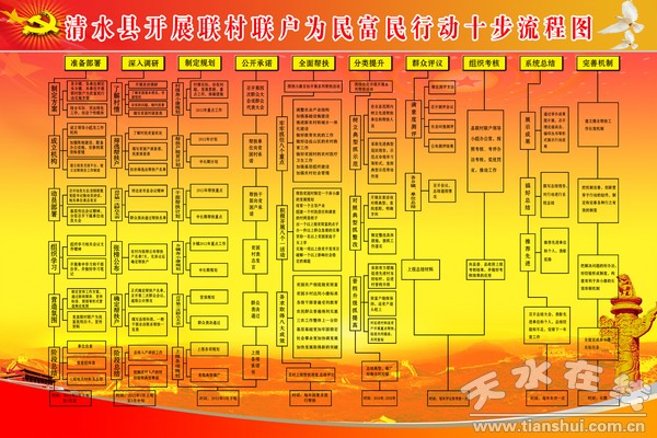 制定了聯(lián)村聯(lián)戶為民富民行動(dòng)“十步流程圖”(前期準(zhǔn)備、深入調(diào)研、制定規(guī)劃、公開(kāi)承諾、全面幫扶、分類提升、群眾評(píng)議、組織考核、系統(tǒng)總結(jié)、完善機(jī)制),分階段、分步驟把每一環(huán)節(jié)、每一方面的主要任務(wù)、具體要求、具體措施以圖表、箭頭的方式,直觀地反映出來(lái),使工作目標(biāo)一目了然、操作措施有據(jù)可依、行動(dòng)時(shí)限明確具體、程序步驟科學(xué)合理,在指導(dǎo)聯(lián)村聯(lián)戶為民富民行動(dòng)中,發(fā)揮了良好作用。