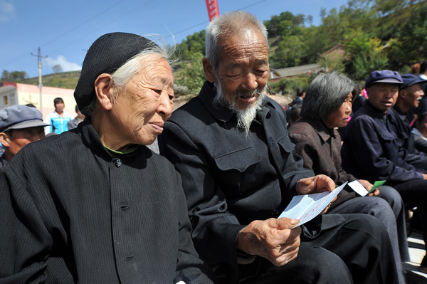 (村民領(lǐng)到養(yǎng)老金)