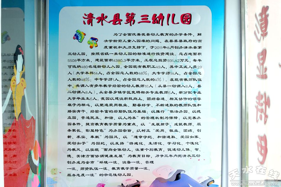 清水縣第三幼兒園于2010年8月立項(xiàng)建設(shè),2011年8月竣工,2012年3月正式投入使用。幼兒園按照省級(jí)一類幼兒園標(biāo)準(zhǔn)規(guī)劃建設(shè),工程總投資1460萬(wàn)元,占地面積5508平方米,建筑面積4380.3平方米,F(xiàn)有教職工58人,其中正式人員28人,教師平均年齡32歲,其中大專以上學(xué)歷占96%。設(shè)有12個(gè)日托教學(xué)班,本學(xué)期共招收幼兒490名,是目前全縣規(guī)模最大的幼兒園。