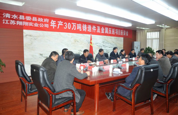 11月15日,清水縣召開(kāi)縣委、縣政府與江蘇翔翔實(shí)業(yè)公司年產(chǎn)30萬(wàn)噸鑄造件及金屬壓延項(xiàng)目座談會(huì)。會(huì)議由縣委書(shū)記劉天波主持,縣人大常委會(huì)主任阮珠有,縣政協(xié)主席陳喜祥,縣委副書(shū)記趙云清,縣委常委、組織部長(zhǎng)剡海明,縣委常委、政法委書(shū)記孟曉龍,縣人大常委會(huì)副主任梁桂林,副縣長(zhǎng)蔡俊杰,縣政協(xié)副主席劉金富,投資商代表金洪兵、林海兵、徐大凱、張挺出席會(huì)議,縣委辦、政府辦、工信局、發(fā)改局、財(cái)政局、公安局、環(huán)保局、工商局、國(guó)土局、住建局、規(guī)劃局、宣傳部、永清鎮(zhèn)、紅堡鎮(zhèn)負(fù)責(zé)人參加會(huì)議。
