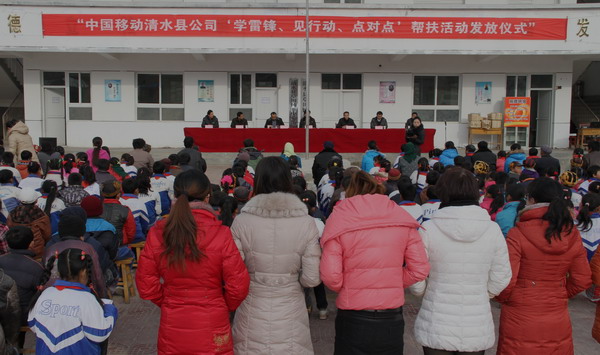 1月8日,天水移動公司 “學(xué)雷鋒、見行動”“點對點”幫扶活動發(fā)放儀式在草川鄉(xiāng)中心小學(xué)舉行。天水市移動公司副總經(jīng)理蔡瑞峰、清水縣政府副縣長何敬忠出席發(fā)放儀式,縣教體局、草川鄉(xiāng)中心小學(xué)全體師生參加了幫扶助學(xué)發(fā)放儀式。