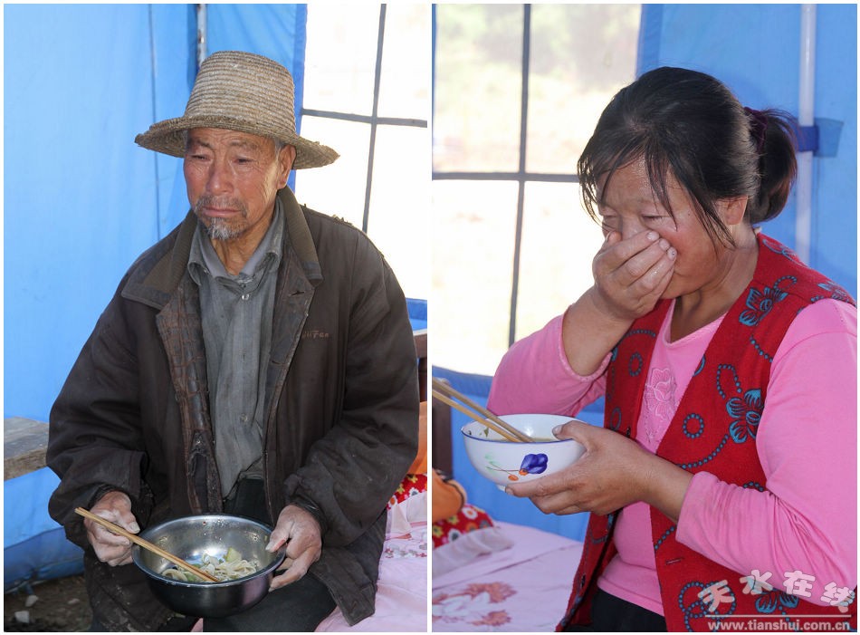 草川鋪鄉(xiāng)段山村村名段永平正在清理倒塌的磚塊,滿臉愁云、沉默無語,當問及房屋受損情況時,其父親眼含淚花、聲音哽咽的告訴記者:“我們這里自然條件查、山大溝深,沒有寬闊的地方居住。2008年汶川地震震倒了我家的老房子,我們一家沒地方住,就花掉了家里所有的積蓄,還貸了一批款,建了8間磚混結(jié)果房屋,感覺現(xiàn)在住著安全了,沒想到,這次災(zāi)害又把我們的家毀了。我們親戚家也沒地方住,就只能住在帳篷里,飯也沒地方作,由鄰居家給我們送飯吃。
