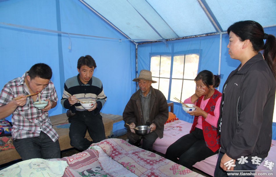 ( 帳篷內(nèi)的受災(zāi)群眾吃上了熱騰騰的面條)