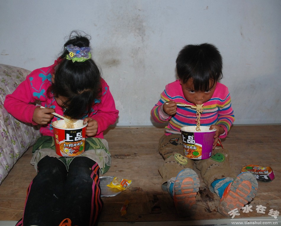 (在臨時(shí)安置點(diǎn)的帳篷里吃方便面的孩子) |