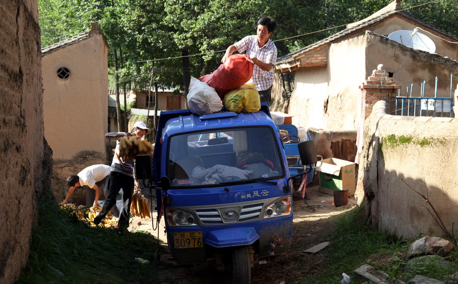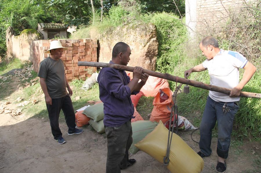 (夜明村曹王自然村山體滑坡,房屋出現(xiàn)大面積裂縫,村民正在轉(zhuǎn)移家里的存糧)