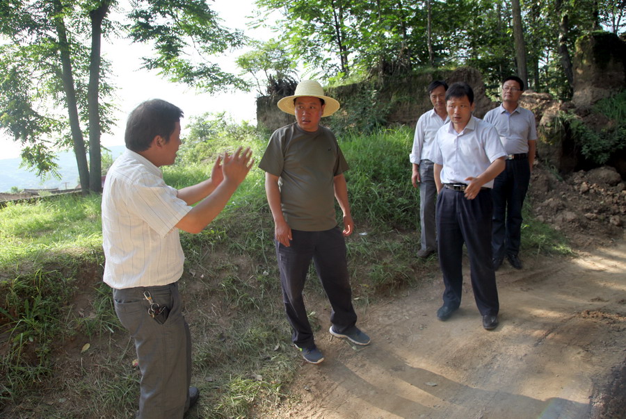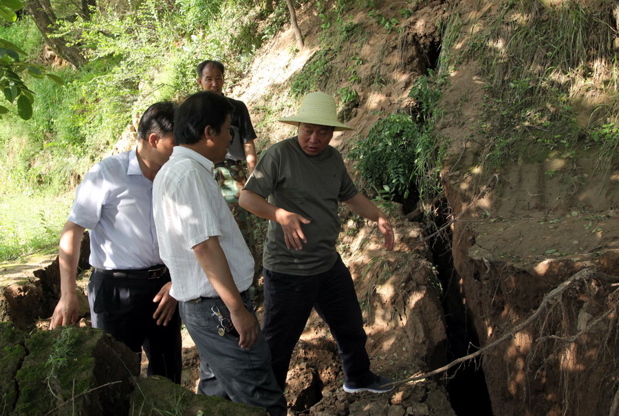 (縣委副書記、縣長馬越垠查看災(zāi)情,夜明村曹王自然村山體滑坡并出現(xiàn)大面積裂縫)