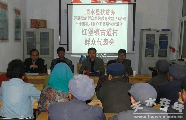 為深入開展黨的群眾路線教育實(shí)踐活動(dòng),認(rèn)真落實(shí)“雙千”干部“458”入農(nóng)戶、聽民聲、解民困、理民事聯(lián)村聯(lián)戶活動(dòng),縱深推進(jìn)“雙聯(lián)”行動(dòng),切實(shí)轉(zhuǎn)變工作作風(fēng)。從4月14日開始,清水縣扶貧辦全體科級(jí)干部、2名副科級(jí)后備干部和普通黨員立即深入聯(lián)系的紅堡鎮(zhèn)古道村、恒吳村,集中開展了“458”聯(lián)村聯(lián)戶各項(xiàng)活動(dòng),干部駐村入戶、征求意見、宣講政策、教育群眾,幫助群眾解決困難與問題。