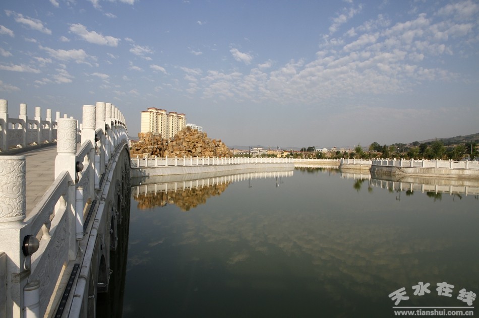 軒轅湖是一處人工湖,是清水縣著力打造的城市景觀工程之一,她與軒轅廣場(chǎng)隔牛頭河相望,中間由軒轅橋連接。軒轅湖景觀工程也是軒轅文化產(chǎn)業(yè)園的重要組成部分,在建設(shè)上古代風(fēng)格與歷史文化緊密結(jié)合體現(xiàn)了清水深厚的文化底蘊(yùn)。軒轅湖工程建成總占地面積87000平方米,湖體及九龍?zhí)端?0000平方米,設(shè)計(jì)的湖體“龍”字和湖水入口處足跡島的“中”字造型抽象生動(dòng),把軒轅黃帝與中國(guó)龍文化有機(jī)結(jié)合,既反映了軒轅文化的深刻內(nèi)涵,又體現(xiàn)了清水作為人文始祖軒轅黃帝出生地的濃厚文化底蘊(yùn)。并利用溯源橋、始祖橋、中華橋、九州橋、龍?jiān)礃虻?座橋梁將湖體分割成“五湖四!,充分表現(xiàn)了軒轅黃帝從這里誕生,開創(chuàng)了華夏文明,炎黃子孫繁衍生息,發(fā)展壯大,遍布中華大地,全球華人同祖同源的深刻含義。在入口處豎立寓意三皇五帝的8根文化柱、西北側(cè)小廣場(chǎng)的景石、東南側(cè)的水車園、農(nóng)耕器具園,體現(xiàn)了軒轅黃帝在遠(yuǎn)古農(nóng)耕文化的歷史地位和聰明智慧。勤勞樸實(shí)的清水人民豐富和傳承了先祖農(nóng)耕文化的內(nèi)容,構(gòu)成了景觀節(jié)點(diǎn),成為該縣弘揚(yáng)軒轅文化、打造軒轅歷史文化名城的重要標(biāo)志。