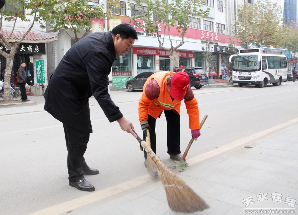 (清水縣領(lǐng)導(dǎo)與志愿者服務(wù)隊一起打掃城區(qū)環(huán)境衛(wèi)生)