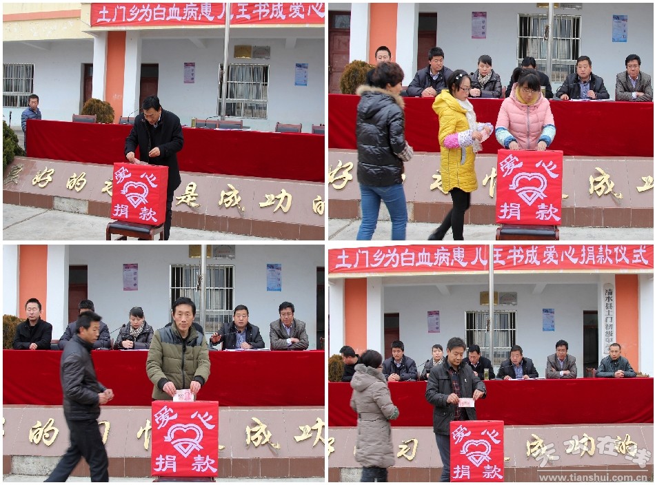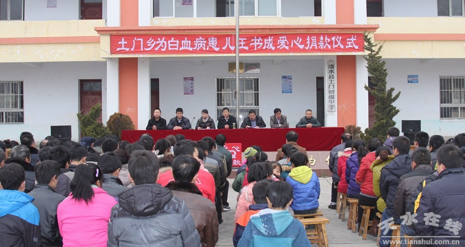 12月26日,土門鄉(xiāng)在鄉(xiāng)中學(xué)舉行為本鄉(xiāng)豐盛村患白血病男孩王書成愛心捐款儀式。清水縣“一對(duì)一獻(xiàn)愛心”貧困兒童資助協(xié)會(huì)負(fù)責(zé)人及社會(huì)愛心人士代表、土門鄉(xiāng)全體干部職工、鄉(xiāng)屬單位負(fù)責(zé)人、鄉(xiāng)中學(xué)全體教師及學(xué)生、鄉(xiāng)學(xué)區(qū)教師學(xué)生代表、13村黨支部書記參加活動(dòng)為白血病患兒王書成捐款獻(xiàn)愛心。