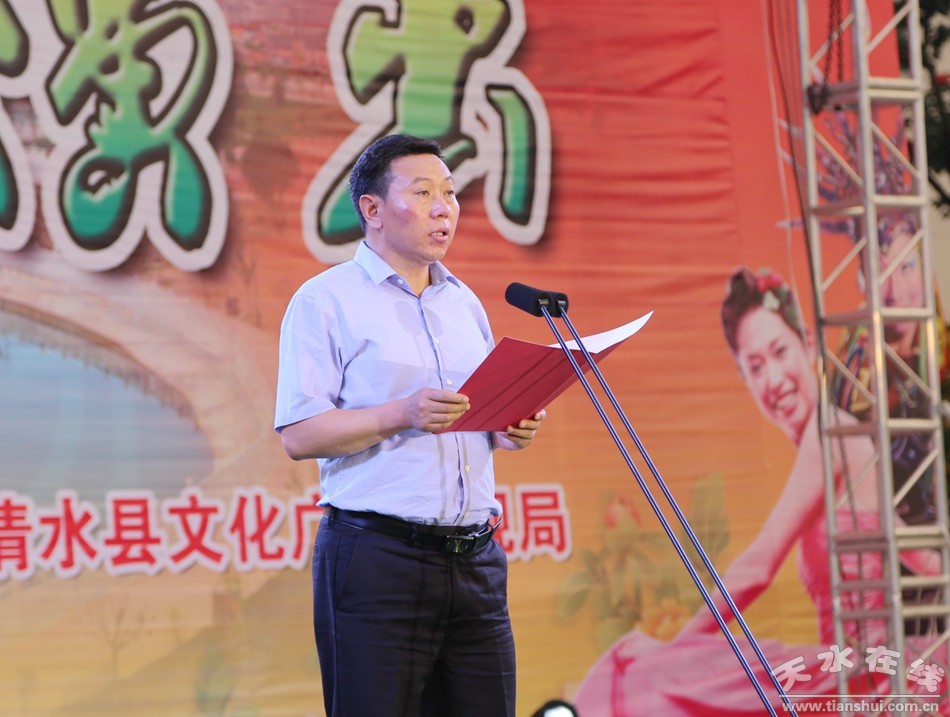 在文藝演出開始前,甘肅省文化館館長陳化平做了講話,陳化平說,近年來,清水縣在黨和政府的關懷下,以創(chuàng)建省級文明縣為契機,始終把精神文明建設擺上重要議事日程,切實加強對精神文明建設工作的引導和推進,積極探索精神文明建設的新特點、新路線,不斷增強工作的針對性和實效性。為滿足全縣廣大群眾業(yè)余文化生活需求,使公民道德建設深入人心,先后舉辦了秦腔票友電視大賽等一系列文化活動,不僅營造了濃厚的宣傳氛圍,提高了宣傳教育質量,更是把方便、實惠和文化帶給了老百姓。