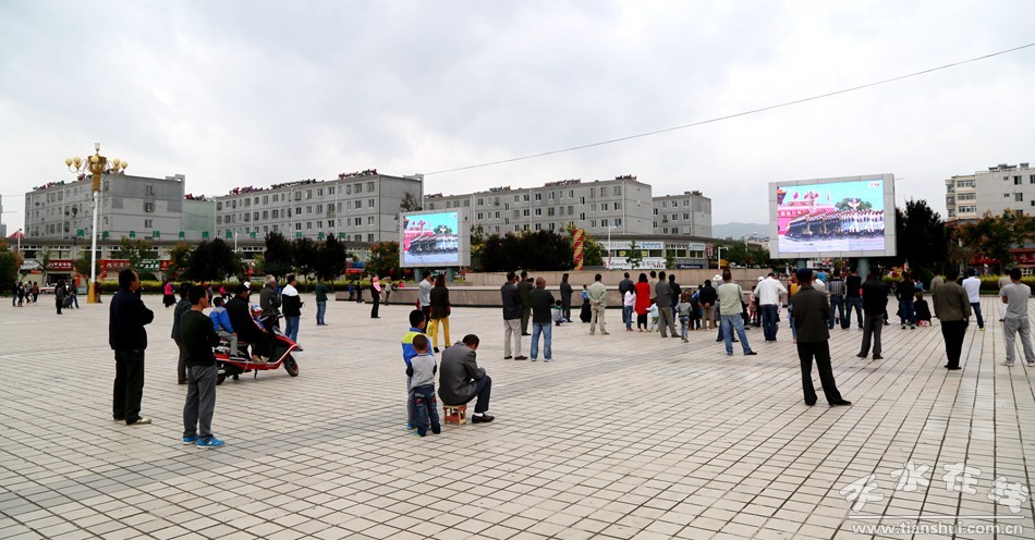 (9月3日上午,清水市民聚集在軒轅廣場上觀看閱兵現(xiàn)場直播)