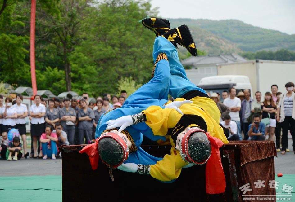 清水“木人摔跤”,源于西漢,鼎盛于明、清時(shí)期,是民間社火的一種表演形式。逢年過節(jié),一些心靈手巧的木工藝人便將制作好的兩個(gè)木人固定在木架上后,橫放在躬腰隱身的一人背上,配以鼓樂,后在隱身人的操作下讓兩個(gè)木人“摔跤”,場面詼諧風(fēng)趣。百姓依托這一民間活動(dòng),祈盼來年風(fēng)調(diào)雨順、五谷豐登。