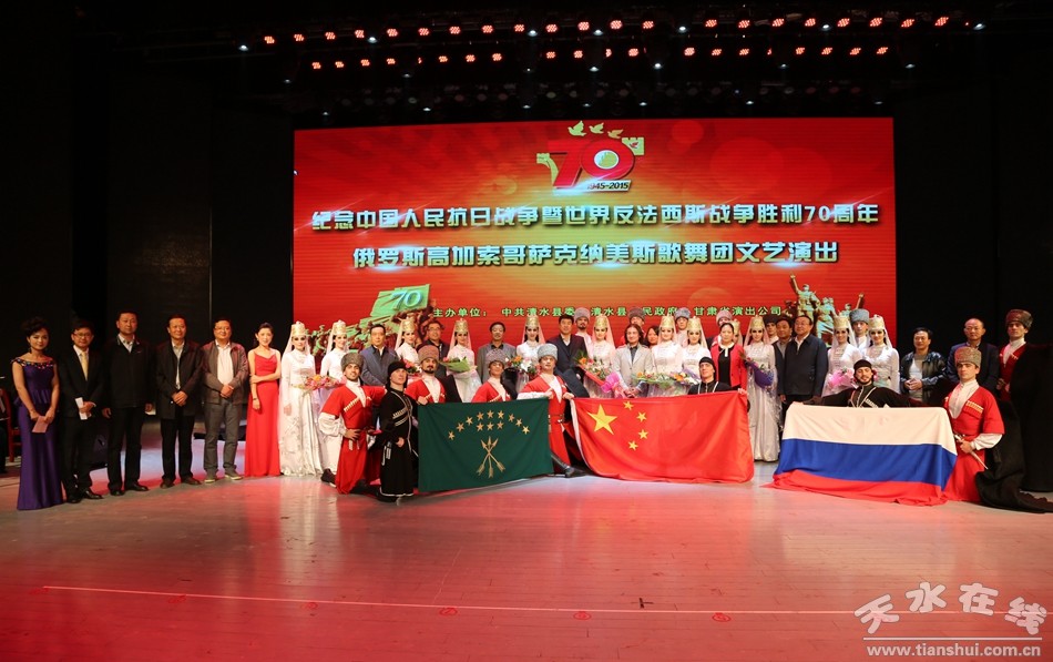 為紀(jì)念中國人民抗日戰(zhàn)爭暨世界反法西斯戰(zhàn)爭勝利70周年,9月30日晚,由甘肅省演出公司特邀俄羅斯高加索哥薩克納美斯歌舞團赴清水縣開展慰問演出,為清水人民奉獻了一場豐盛的文化盛宴。清水縣廣大干部群眾觀看了精彩的節(jié)目表演。