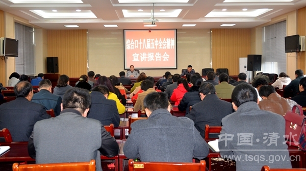 11月12日下午,清水縣綜合口舉行黨的十八屆五中全會精神宣講報告會?h委黨校講師趙韡應邀作宣講,縣政府辦公室副主任段昺主持報告會。綜合口各單位干部職工80余人參加了宣講會。
