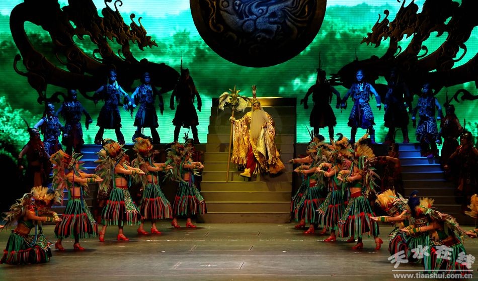 由清水縣文廣局創(chuàng)排的歌舞傳奇劇《軒轅大帝》,是此次優(yōu)秀劇目展演開幕式上打頭陣的作品。之所以被安排在第一個登場亮相,有其特殊性:這是迄今為止國內(nèi)首部把古老的秦腔藝術(shù)用歌舞劇的方式加以呈現(xiàn)的劇目;全劇演員,包括舞美、視頻、燈光設(shè)計等全部由本土鄉(xiāng)村文化工作者、農(nóng)民等非專業(yè)人員擔(dān)綱。此外,在地域特色文化、始祖文化的挖掘上,清水縣通過這部戲找到了切入點。而現(xiàn)代秦劇《大河兒女》,則由甘肅秦腔藝術(shù)劇院有限公司創(chuàng)排,這是10年前獲得過無數(shù)榮譽的秦劇《大河情》的改進版。改版后的《大河兒女》一經(jīng)亮相,就贏得贊譽。此前,國內(nèi)影視界涉及抗戰(zhàn)題材的作品不少,但把抗戰(zhàn)題材搬上戲劇舞臺的不多見,而且又是民族題材,這樣的作品對編劇來說是最大的考驗,也承擔(dān)著不小的壓力。然而,當(dāng)舞臺上回漢等各族兒女共同發(fā)出“愛自己的國家,如鳥愛其巢”的鏗鏘呼聲后,觀眾被劇情感動,更為臺上演員的表演而折服。舞臺上,“花兒”悠揚,秦聲激蕩,兩種不同唱腔的融合天衣無縫。