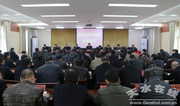 2月14日上午,清水縣委書記劉天波主持召開四大組織聯(lián)席會(huì)議,傳達(dá)學(xué)習(xí)習(xí)近平總書記在中共中央政治局第三十次集體學(xué)習(xí)時(shí)的講話精神及省委書記王三運(yùn)在2016年甘肅省黨政軍春節(jié)團(tuán)拜會(huì)上的講話精神,安排部署精準(zhǔn)扶貧、春節(jié)文化活動(dòng)、社會(huì)治安、項(xiàng)目建設(shè)等近期各項(xiàng)重點(diǎn)工作。