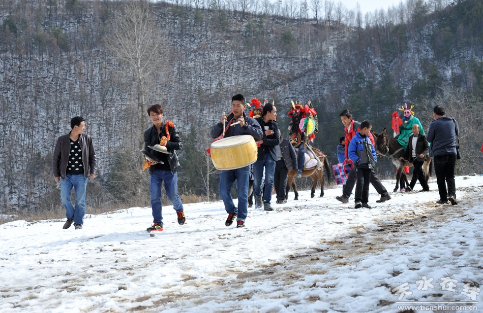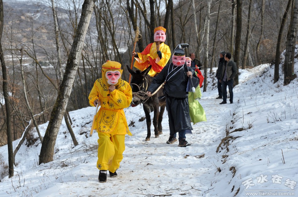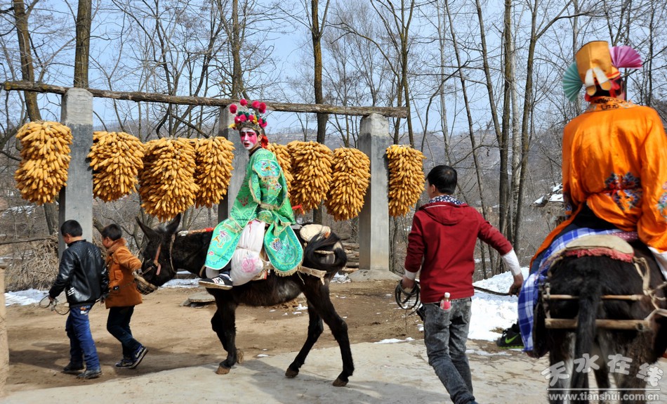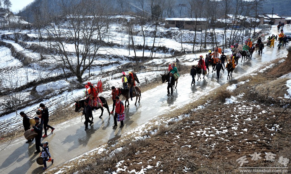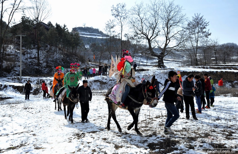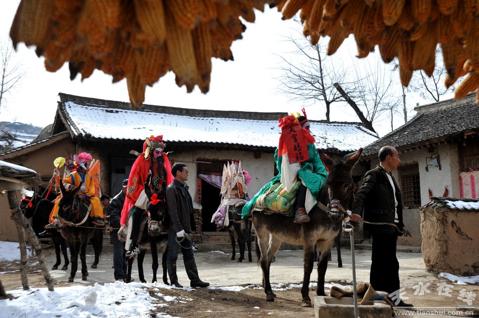 每年正月,清水大地各村莊都以各種形式慶祝春節(jié),特別是初五、初九、初十、十二、十四、十五、十六等這些日子,群眾都會自發(fā)耍獅子、扭秧歌、劃旱船、唱小調(diào)、踩高蹺、“轉(zhuǎn)”馬社火。在清水縣隴東鄉(xiāng)坪道村流傳著一種民間社火——馬社火。這一傳承已久,熱鬧非凡的“馬社火”每年正月都要在上九、十三這兩天,伴隨著鑼鼓聲走村串巷、熱熱鬧鬧、雷打不動的“轉(zhuǎn)”起來,給新春的山村增添無限歡樂。