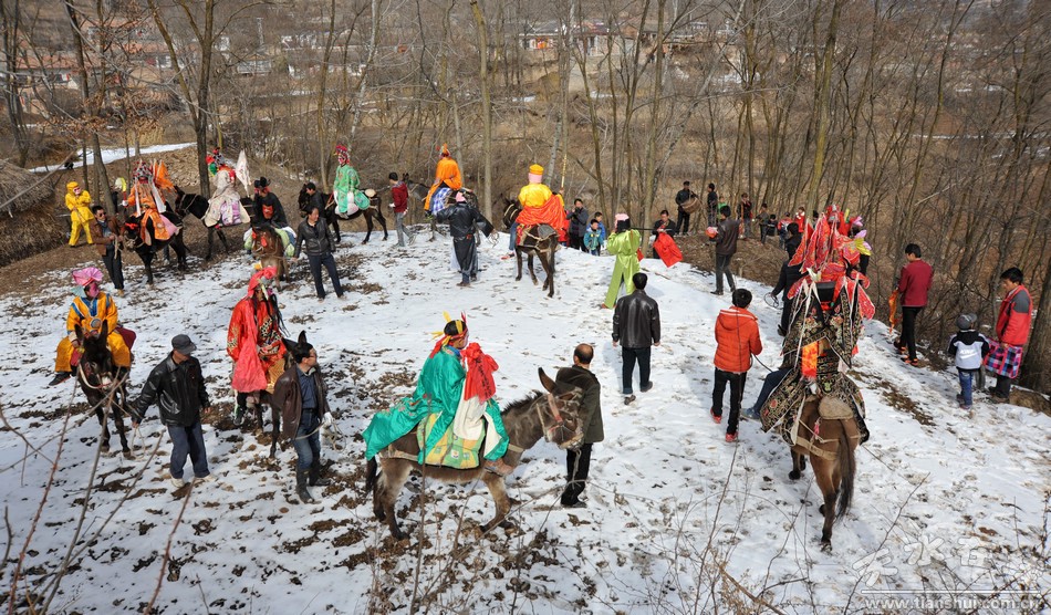 馬社火就是騎在馬背上演出的一種民間藝術(shù),是我國西部山區(qū)群眾根據(jù)居住的地形、地理特點和條件,借助畜力而創(chuàng)造的一種藝術(shù)形式。因其衍生于秦腔,是一個只演不唱的劇種。要按歷史戲劇故事裝扮成各個角色,穿戴傳統(tǒng)戲劇服裝騎在馬上,騾馬列隊成行,于進行間變化動作姿勢,敘述故事內(nèi)容。