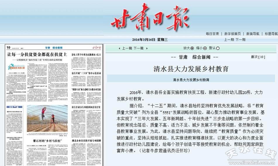 2016年,清水縣將全面實施教育扶貧工程,新建行政村幼兒園20所,大力發(fā)展鄉(xiāng)村教育。