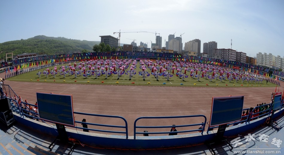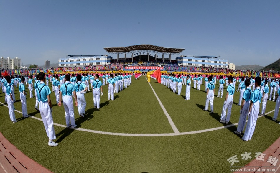 開幕式上,彩旗迎風(fēng)飄揚(yáng)匯成彩色的海洋,鼓號(hào)隊(duì)號(hào)音嘹亮,響徹云霄,激越的鼓點(diǎn)敲出了清水人民的志氣,嘹亮的號(hào)角奏出了軒轅兒女的自信;每一支代表隊(duì)必將成為展示各學(xué)校風(fēng)彩,振奮精神,鼓舞斗志,凝聚人心的體育盛會(huì);伴著歡快的旋律,踏著動(dòng)感的節(jié)拍,數(shù)百名學(xué)子齊聚體育場,帶來氣勢恢弘、催人奮進(jìn)的大型團(tuán)體操表演。在行云流水般的動(dòng)作、起伏變換的隊(duì)形中,一幅幅圖形躍然眼前,這些圖形時(shí)而堆成文字,時(shí)而搖身一變成了盛開的花朵,讓人感覺美不勝收。一幅幅寓意深刻圖案造型在學(xué)生的跑動(dòng)不斷呈現(xiàn),充分展現(xiàn)了清水學(xué)子們陽光自信的精神風(fēng)貌和朝氣蓬勃的青春活力。